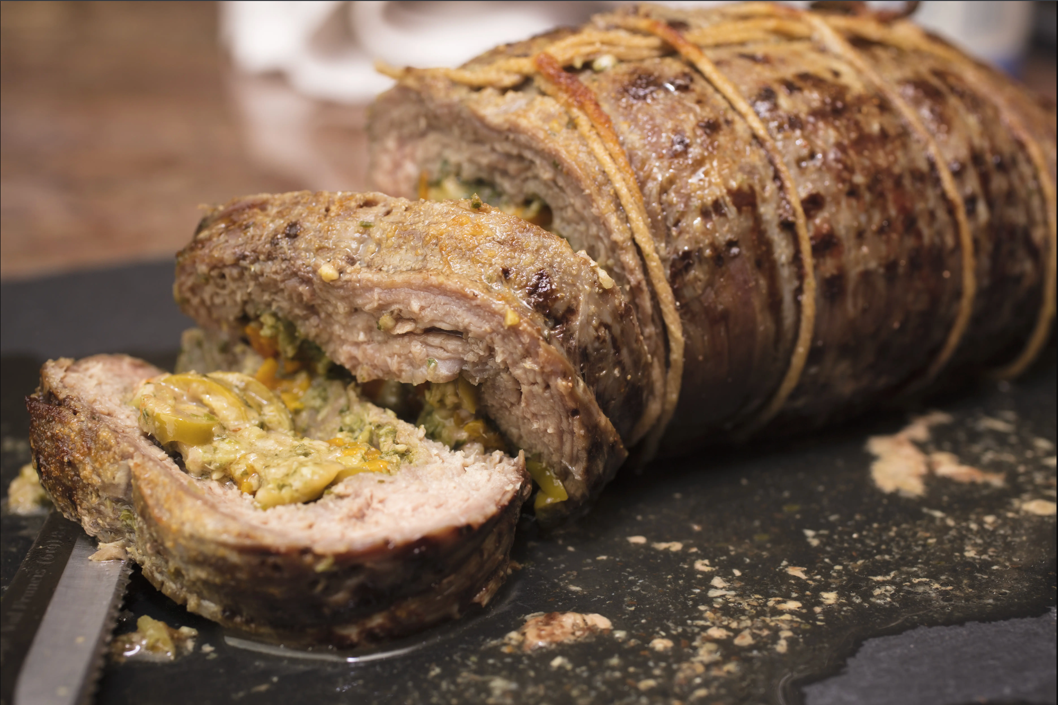 Enroulez la viande aussi serrée que possible, en partant du bas, comme un gâteau roulé. Vous allez l'enrouler dans le sens du grain. Attachez la viande environ tous les 5 cm et d'un bout à l'autre avec de la ficelle de boucher. Enduisez toute la surface d'huile d'olive.