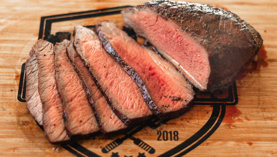 Let it rest for a couple minutes to keep the juices inside and finish cooking. Slice it against the grain to form your steaks (when you cut it in small pieces it will be on the opposite direction to the grain, so it is as soft as it can be).