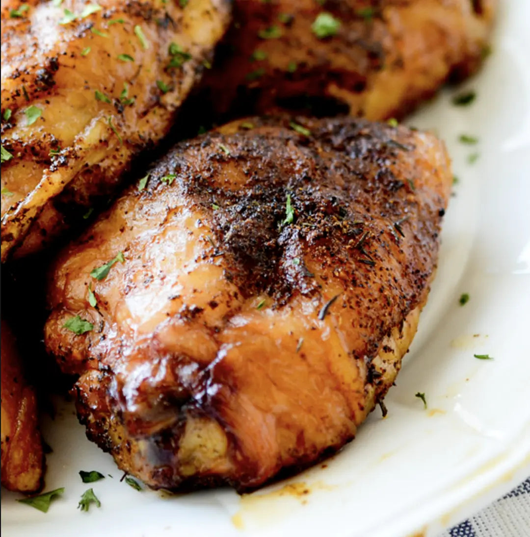Pat dry and place thighs in a non-corrosive bowl or plastic bag. Pour marinade over thighs, refrigerate and brine for 7 - 8 hours.