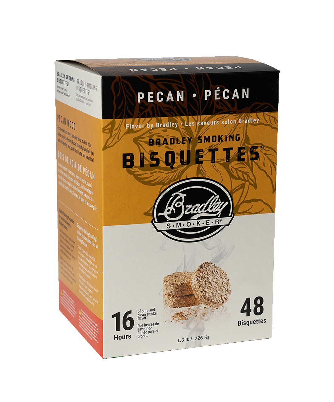 Les Bisquettes de bois de pécan Bradley Smoker ® sont fabriquées à partir de bois pur. Vous pouvez ainsi fumer des aliments avec un goût pur et délicieux.