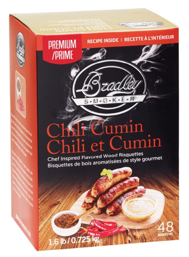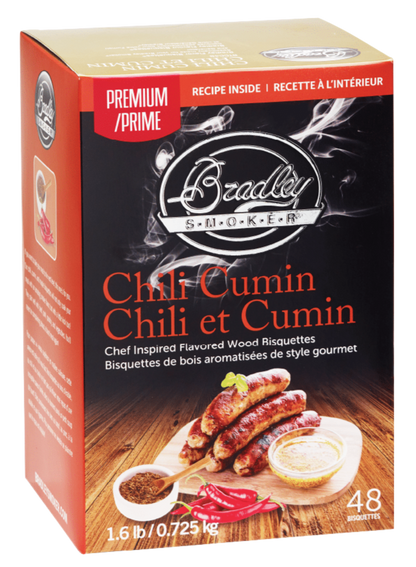 Bradley Smoker Premium Chili Cumin Wood Bisquettes ® are made from pure wood. So you can smoke food with pure delicious taste.