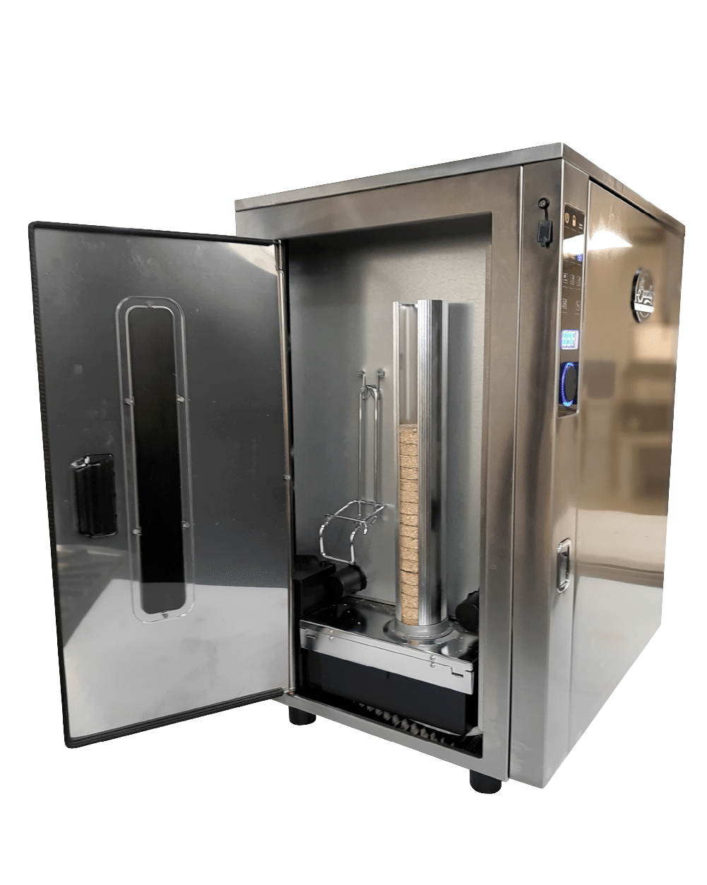 Bradley Smoker Professional P10 is our new Hot Smoker! The 4 Rack Food Smoker is perfect for professional chefs and food smoking fans. To master hot and cold food smoking. Improved temperature accuracy! Featuring PID controlled heating. In other words, heat up and recover temperature quickly. Above all enjoy a no babysitting, no hassles experience. Fully automatic, the smoker allows you to simply load Bisquettes and smoke for up to 10 hours. Featuring dual temperature probes to measure the internal temperature of your recipes. Therefore, never miss doneness again. Expand to 5 racks with the P10 Smoker Extra Rack (sold separately). Completely insulated and digital (you choose the time, temperature, and amount of smoke). You get consistent, deliciously-smoked results. Every time! Professional grade 76L stainless steel body design. Exclusive smart smoking with up to 50 of your favourite recipes. Specifically designed so you can create and download using a USB stick. Controlling, time, smoke, and temperature for the perfect recipe. *Note: cold food smoking in the P10 is achieved through the addition of a large tray of ice in the P10 along with no addition of heat. Further, cold smoking is better achieved during a colder external ambient temperature Bradley Bisquettes are sold separately.