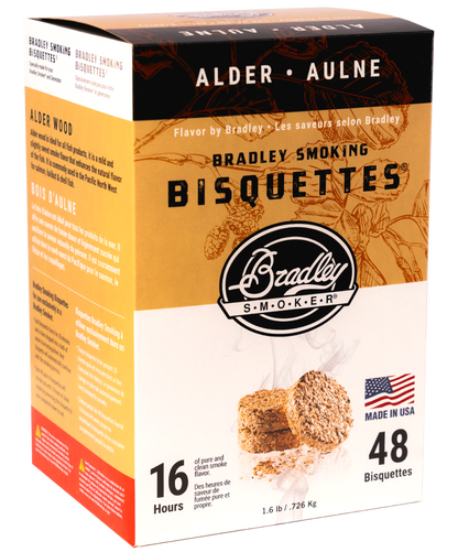 Alder, the wood of the North West, is most commonly used for smoked salmon because of its milder flavor. However, thanks to its light, sweet, and musky flavor, Alder Bisquettes add a smooth smoke flavor perfect for almost any dish.