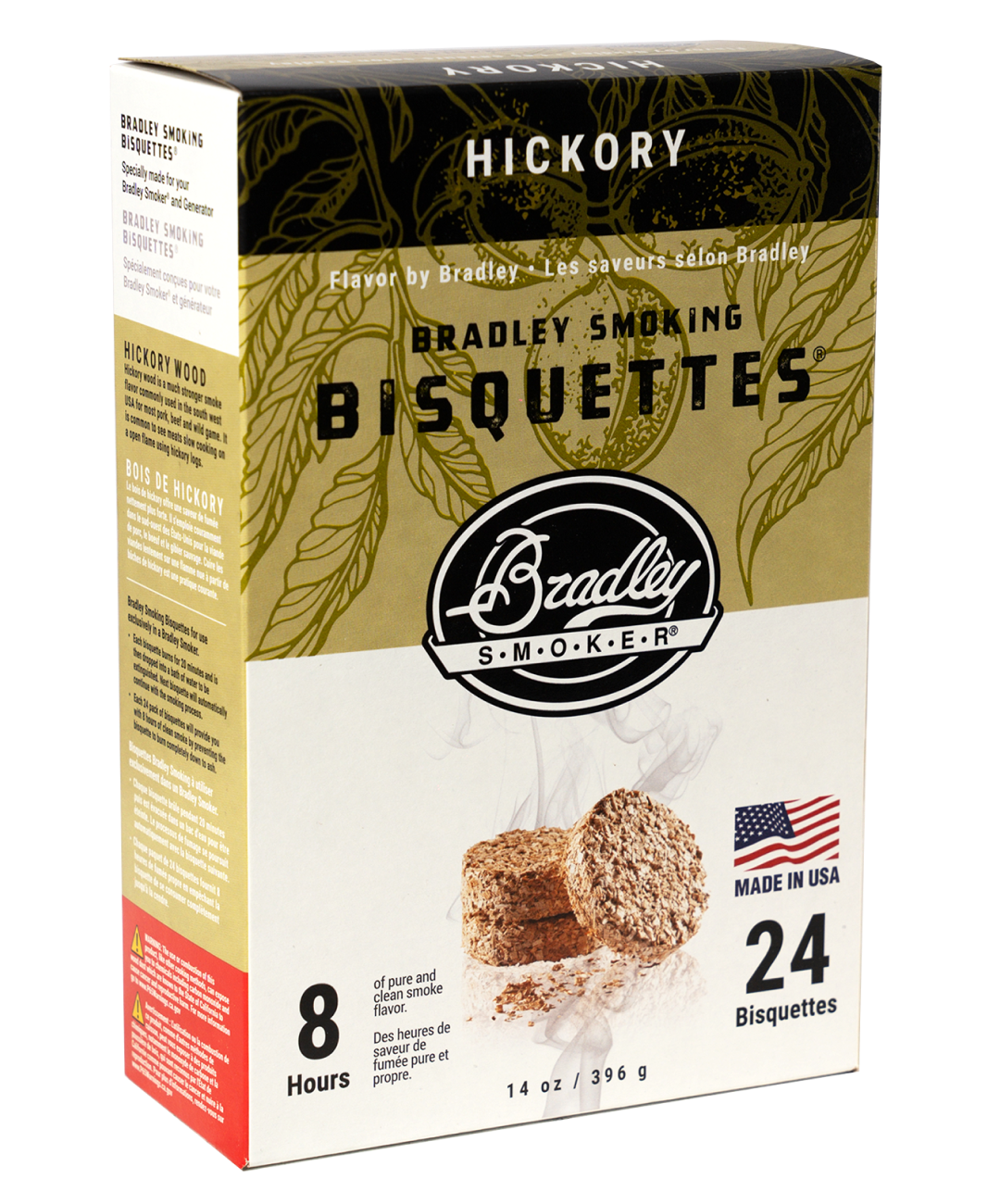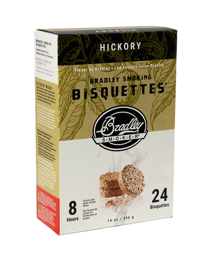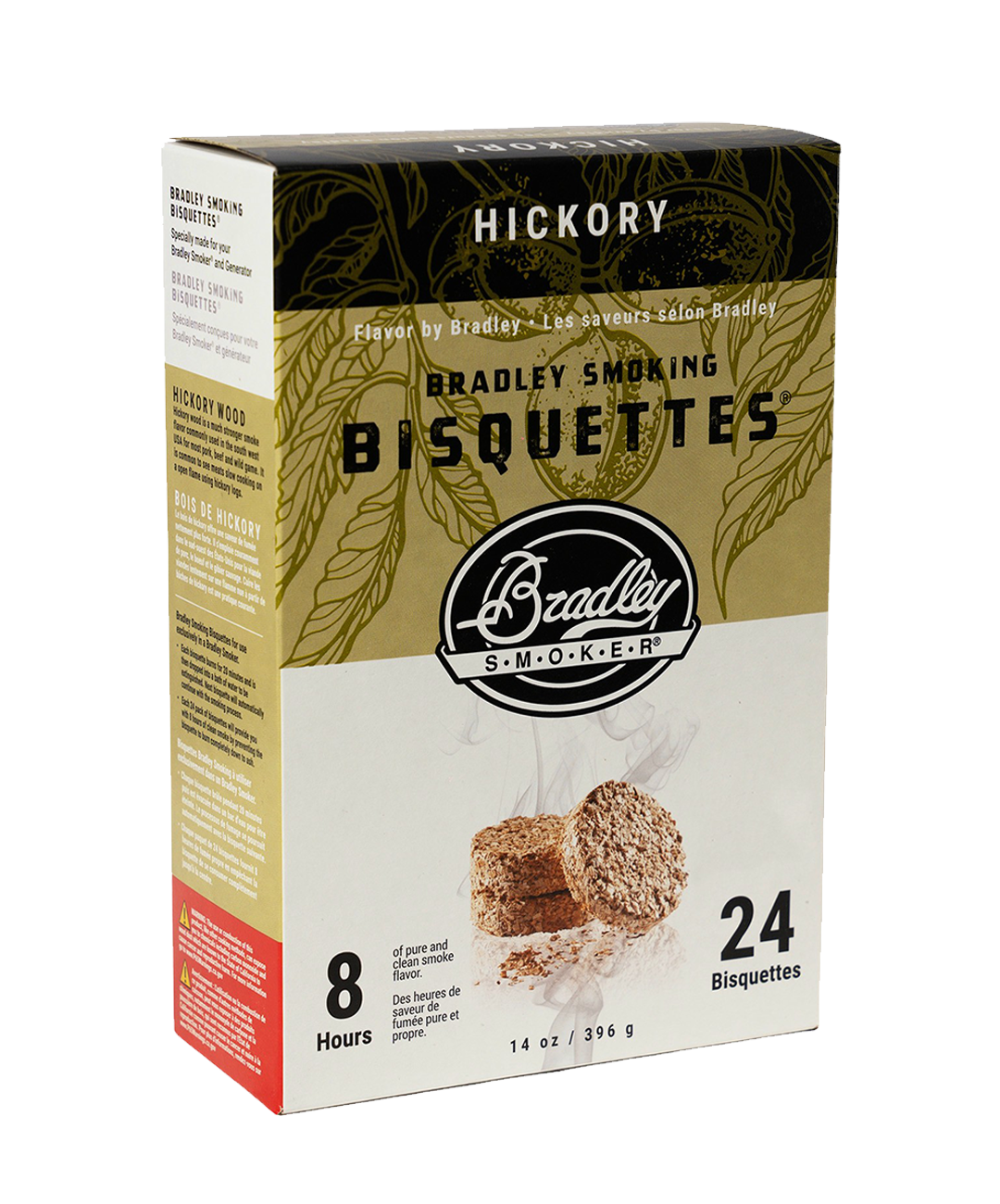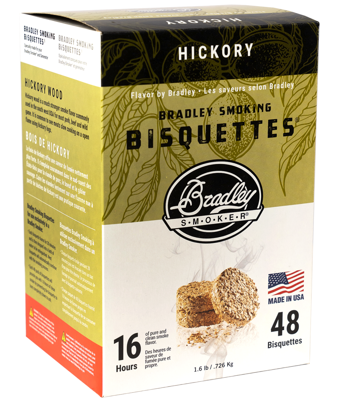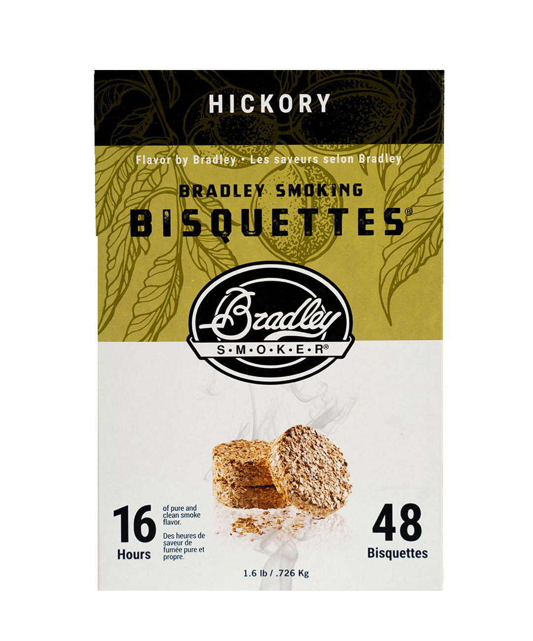 The strong and sweet flavor of Hickory Bisquettes make it one of the more popular woods for smoking, and especially pairs well with poultry, beef, pork, game, water fowl, nuts, and cheese.